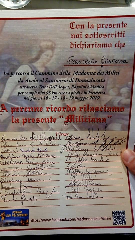 OGNI ANNO NELLA TERZA SETTIMANA DI MAGGIO IN SICILIA, DA AVOLA A DONNALUCATA, A PIEDI, IN BICICLETTA O A CAVALLO, PER CINQUE GIORNI Nel 2020 l'ottava edizione del CAMMINO DELLA MADONNA DELLE MILIZIE si realizzerà nei giorni 20-21-22-23 e 24 maggio 2020 come sempre con il colore arancione delle nostre magliette senza quota di adesione e senza costi inutili per i pellegrini partecipanti. Si consiglia di arrivare al punto di partenza, Avola, entro le 18 della sera prima dell’inizio del cammino, e cioè martedì 19 maggio. Appuntamento sul sagrato della Chiesa Madre in Piazza Umberto I. Per per quel che riguarda il pernottamento sarà tutte le notti obbligatoriamente con stuoino e sacco a pelo in strutture ecclesiali con donativo, salvo preferenze personali in B&B o alberghi, di cui ciascuno darà notizia. Cammino senza quota di adesione e rigorosamente senza tasse improprie per i pellegrini.
