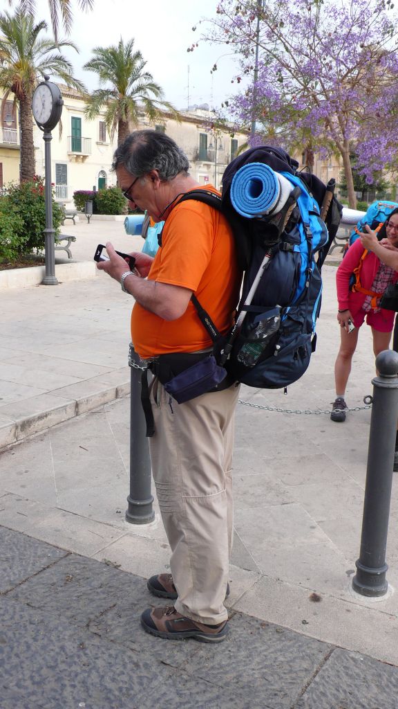 Ciccio Urso in partenza con decine di altri pellegrini per la prima tappa del Cammino della Madonna delle Milizie (Avola 120-5-2016)